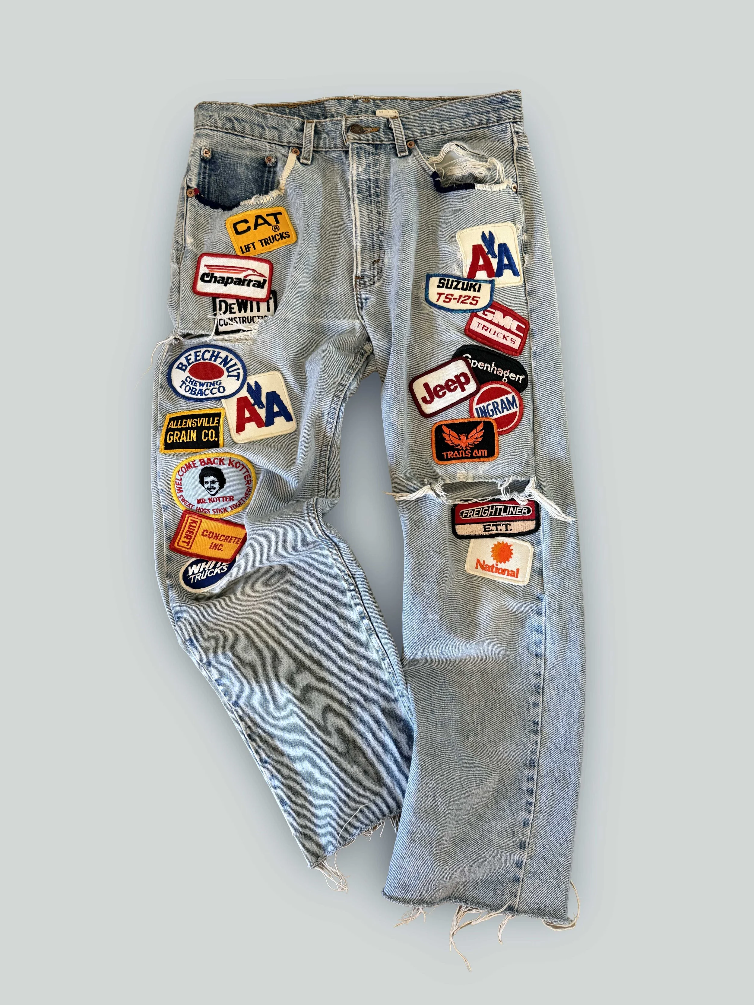 Oversized light wash Levi’s 505 adorned with vintage patches. Worn, loved and tattered denim with embroidery on pockets. Wear these low slung with your fave oversized button-down and boots. Everything can be made custom so please inquire about custom orders and custom sizes.