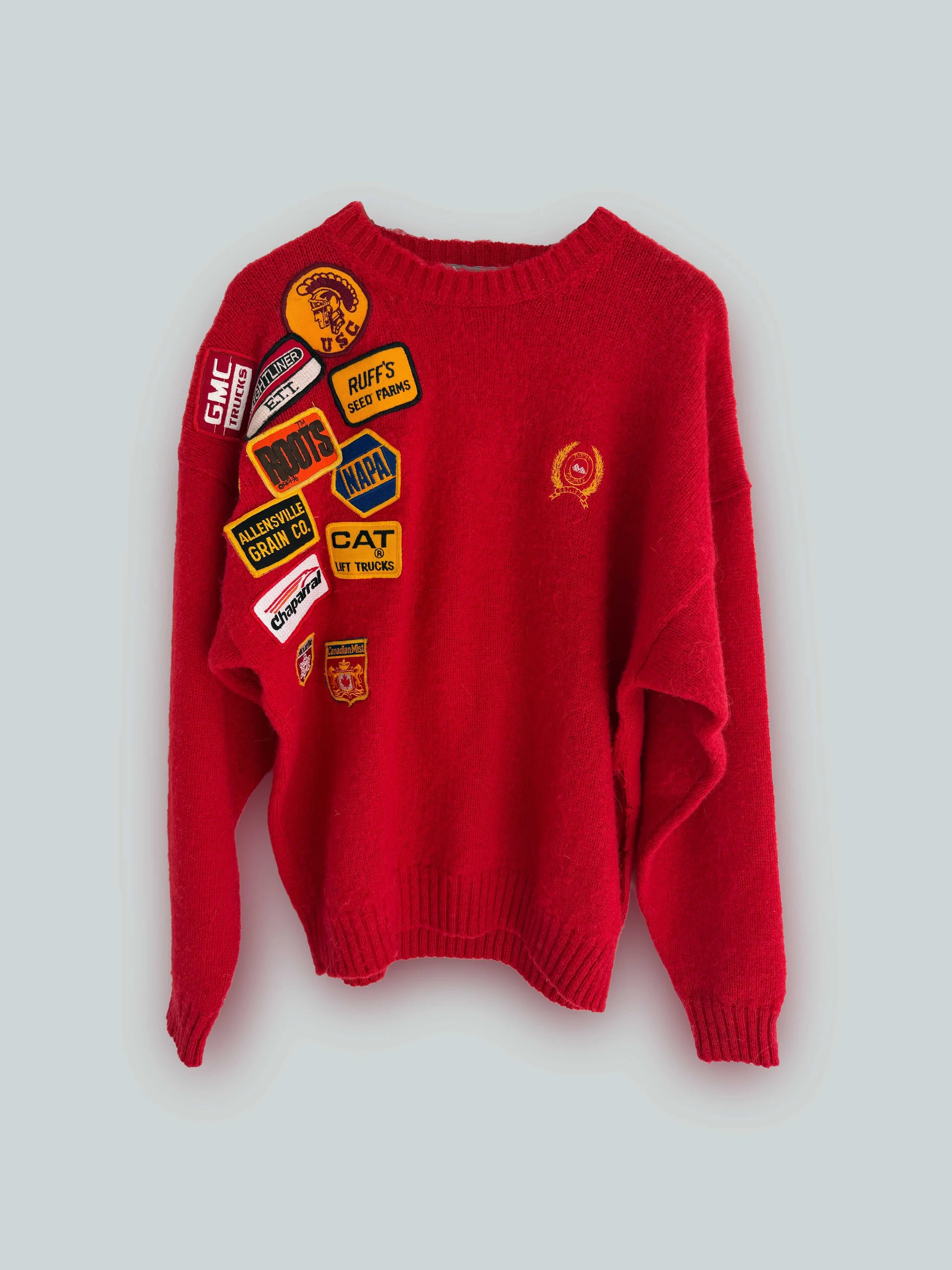 Oversized vintage wool red sweater re-worked with eleven vintage patches hand sewn on and side slit at hem. Wear with your fave vintage denim or dress up with a mini skirt and heels for a night-time vibe. Sideseam is has a side slit. Please inquire about custom orders.