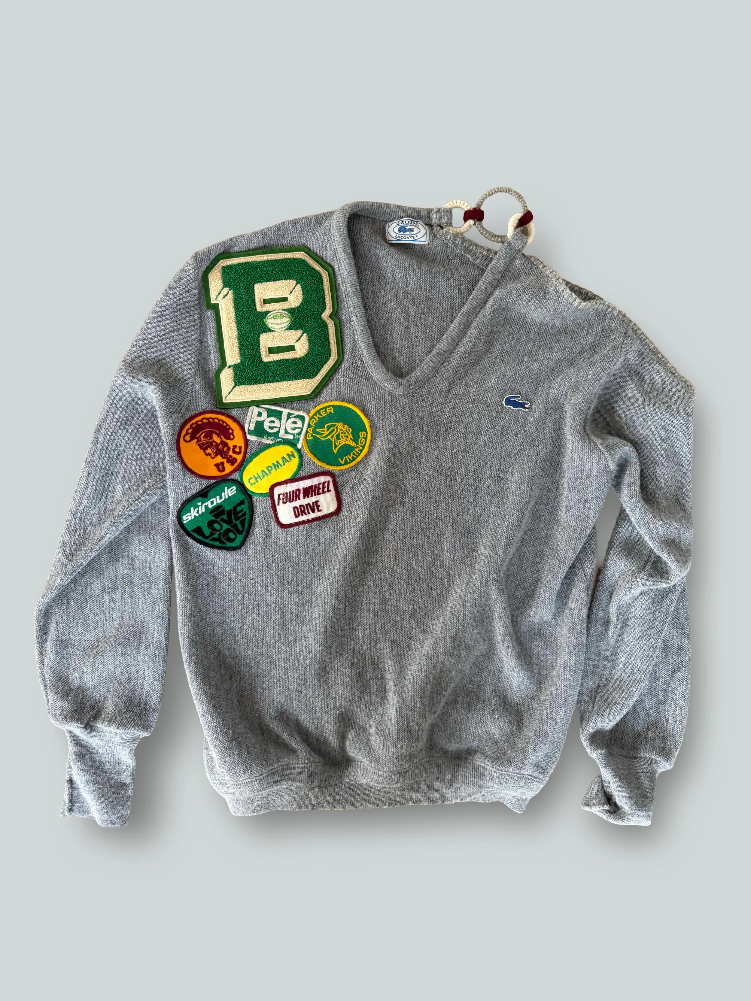 Our vintage IZOD (re)worked grey lightweight sweater featuring curated vintage patches for a one-of-a-kind look. Left side has crocheted rings at shoulder for an open side sleeve. All hand embroidered.